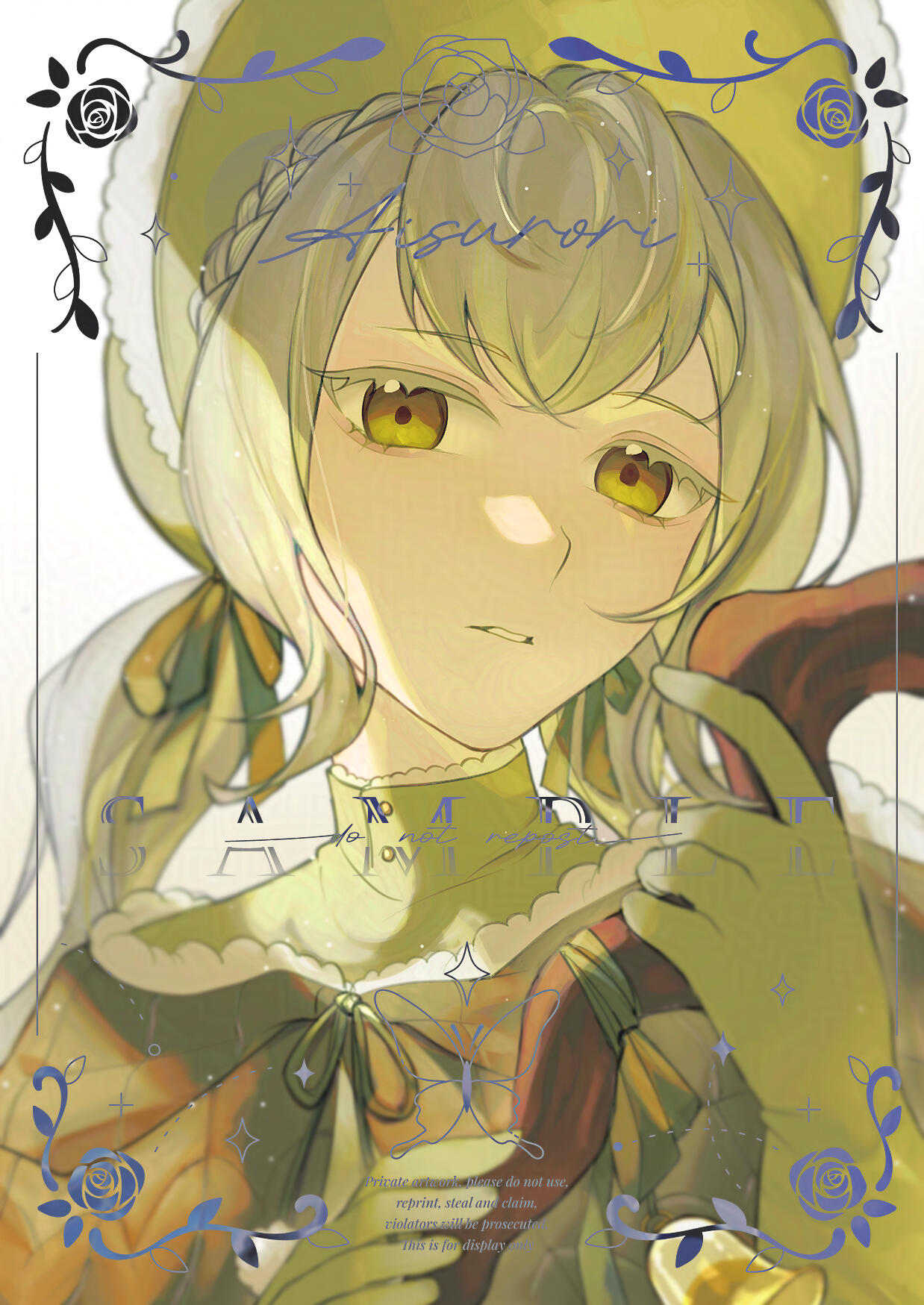 Do not use my works to feed into AI; do not copy, trace, steal; do not use as NFT.