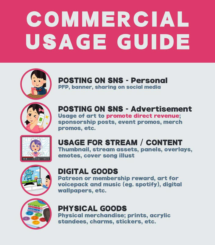 All commissions has commercial rights included, ready to be used in streaming and redistribution/resell/indie merchandising with the exception of company or agency merchandising.